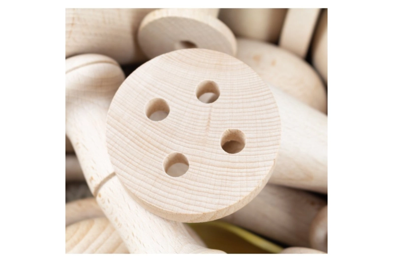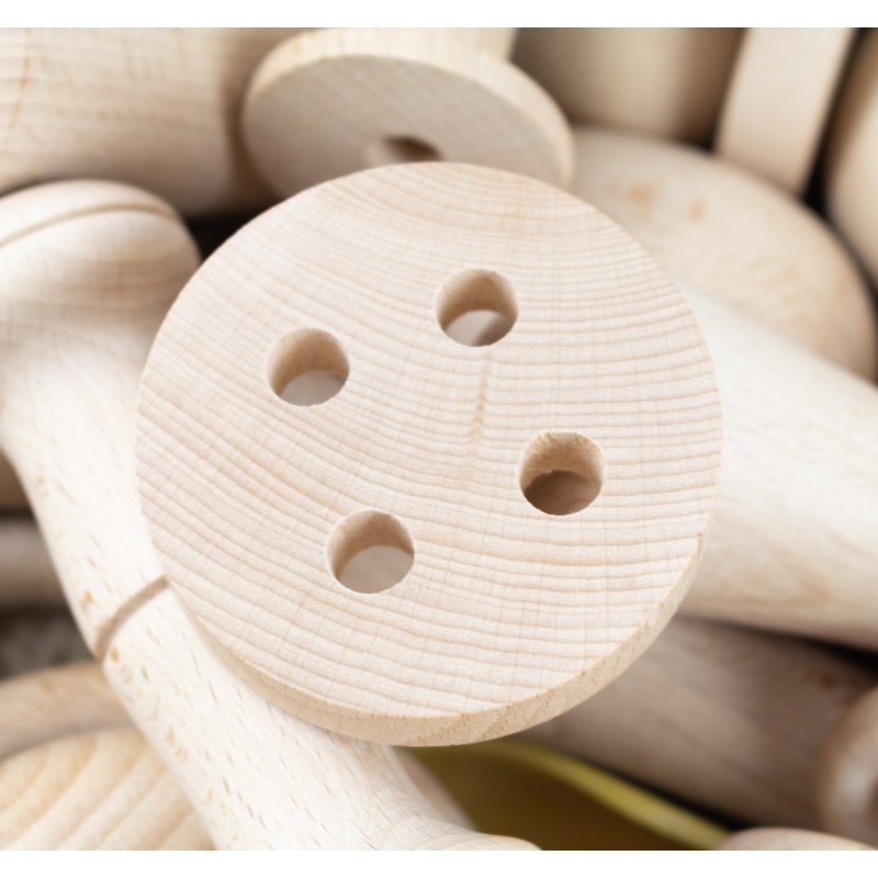 Els podem donar vida de moltes formes, una peça per a manipular, la podem fer rodar, apilar amb altres materials, les possibilitats de joc s’amplien si passem cordons fils pels seus forats, practiquem la motricitat fina i la paciència. O fins i tot els podem pintar, utilitzar com a decoració o per a altres manualitats.