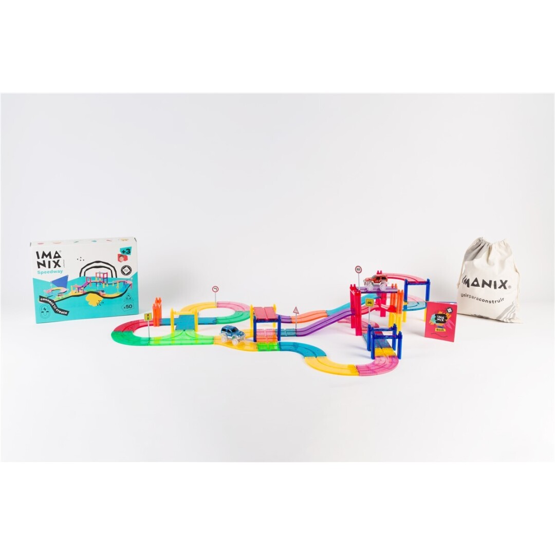Joc de construcció magnètic Imanix pista de carreres amb 50 peces translúcides de colors per crear pistes de carreres.