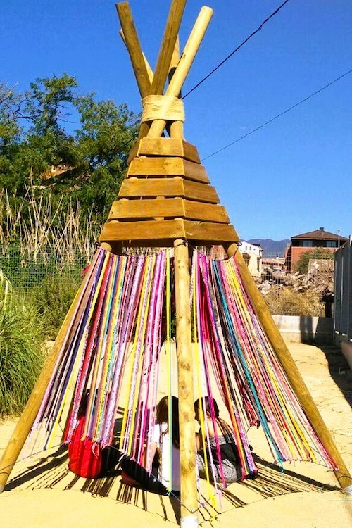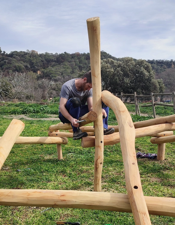 Dissenyem i construïm estructures de joc que fomenten la descoberta, la relació, l’experimentació i el moviment. Creem cabanes i amagatalls, racons per al joc simbòlic, circuits d’equilibri, desnivells amb sorra i pneumàtics, espais per grimpar, ajupir-se o senzillament seure i gaudir.