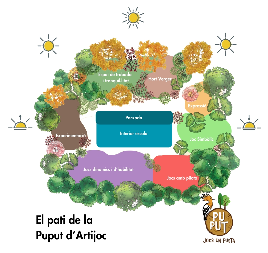 Una de les grans motivacions que tenim a Puput és ajudar a reinventar els patis de les escoles. Dissenyem i construïm tot tipus d’estructures de joc per facilitar i promoure espais de descoberta, relació, experimentació i moviment. Cabanes i amagatalls, racons de joc simbòlic, circuits d’equilibri, desnivells amb sorra i neumàtics, trepar, ajupir-se, seure... Però no ens quedem aquí, amb el temps hem desenvolupat experiències amb la construcció d’horts escolars, la introducció de vegetació perenne i l’acollida de la fauna urbana (insectes, ocells, ratpenats). Creiem que els patis han d’esdevenir un dels llocs preferits dels infants, un espai que perduri en el record, com totes les coses bones que aprenem a l’infància, el límit està en la imaginació!