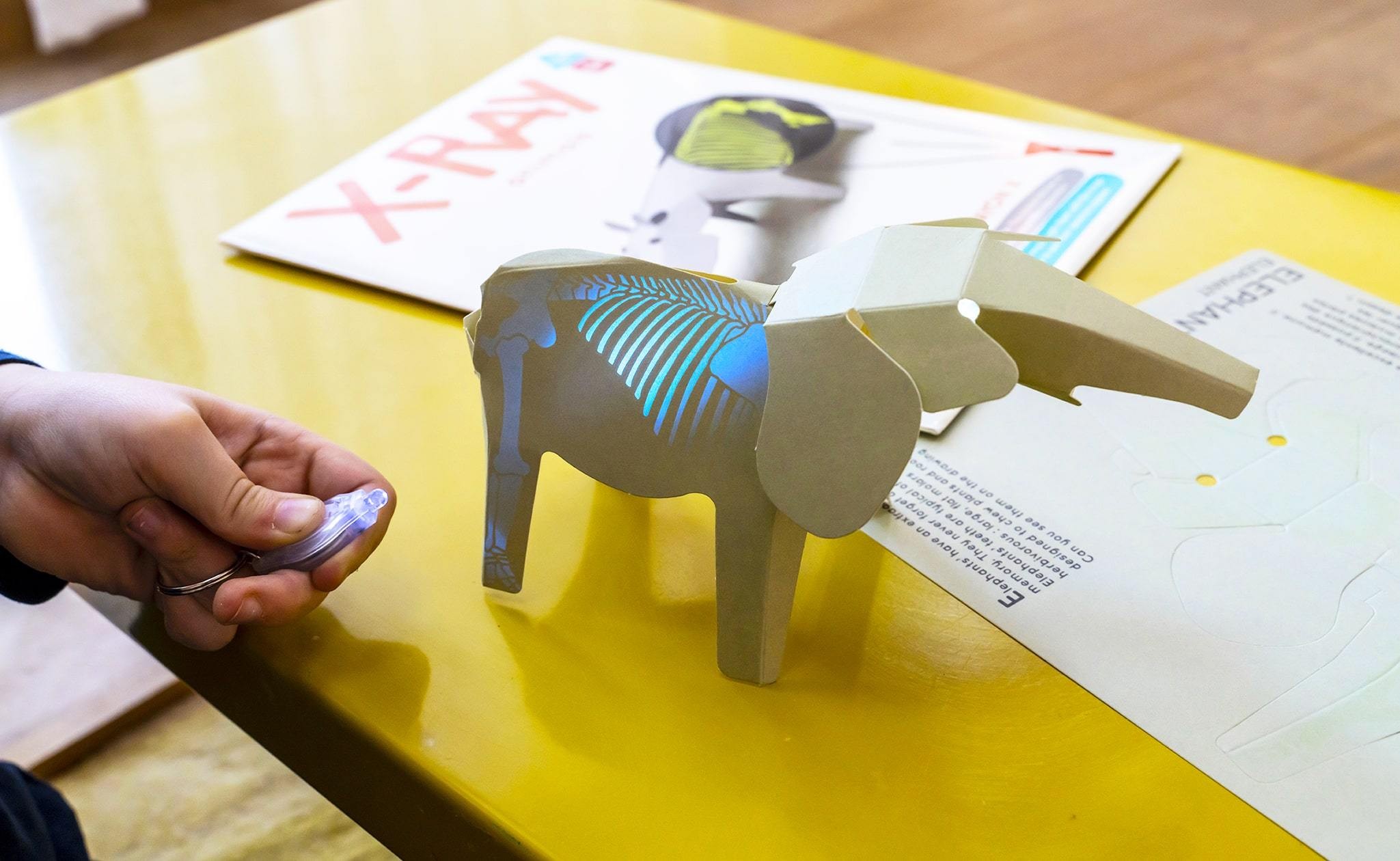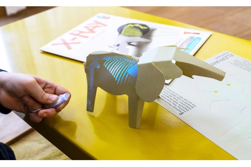 Gràcies a la làmpada màgica inclosa al kit, haureu d’encendre els animals per veure com apareixen els seus esquelets com per art de màgia sota els raigs X.