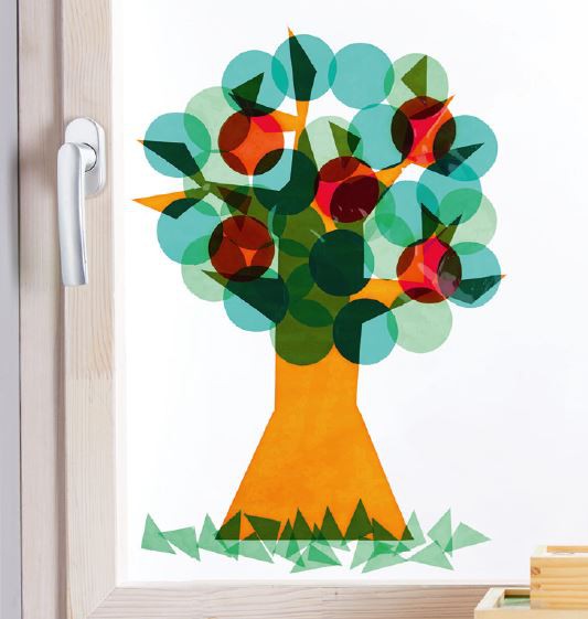 Basta con pegar el tronco en la ventana y elegir los colores que queramos pegar según la temporada que nos encontramos. Círculos, semicírculos o triángulos podrán ser hojas, flores y frutos.