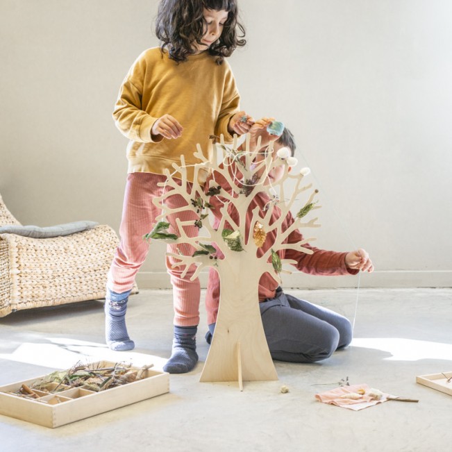 Este árbol de madera también puede ser un recurso bonito para las tablas de estación, tan asociadas a la pedagogía Waldorf. Añadiendo cualquier pieza suelta natural como los frutos del bosque, las hojas, las ramas, las piedras… o cualquier otro material no estructurado (pañuelos, velas, dibujos…) puede ayudar a recrear las estaciones y a celebrar así el paso del tiempo de manera muy simbólica.