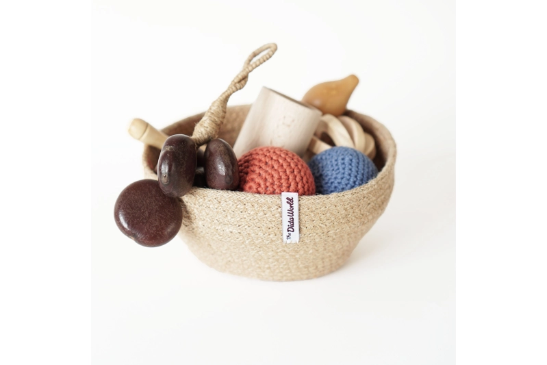 Cuencos de Yute pensados para clasificar y almacenar objetos, son perfectos para tener ordenado los materiales del juego heurístico y para utilizarlos como cesto de los tesoros, su poca profundidad facilita que puedan acceder a sus materiales con facilidad. Son también una propuesta interesante para que los niños utilicen el cesto como parte de su juego.