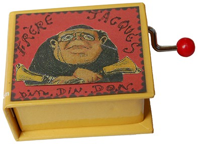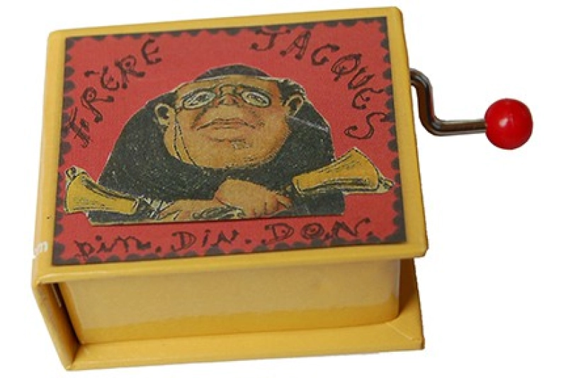 Este mecanismo musical de 18 láminas con manivela se presenta en una caja de cartón ilustrada en forma de libro.