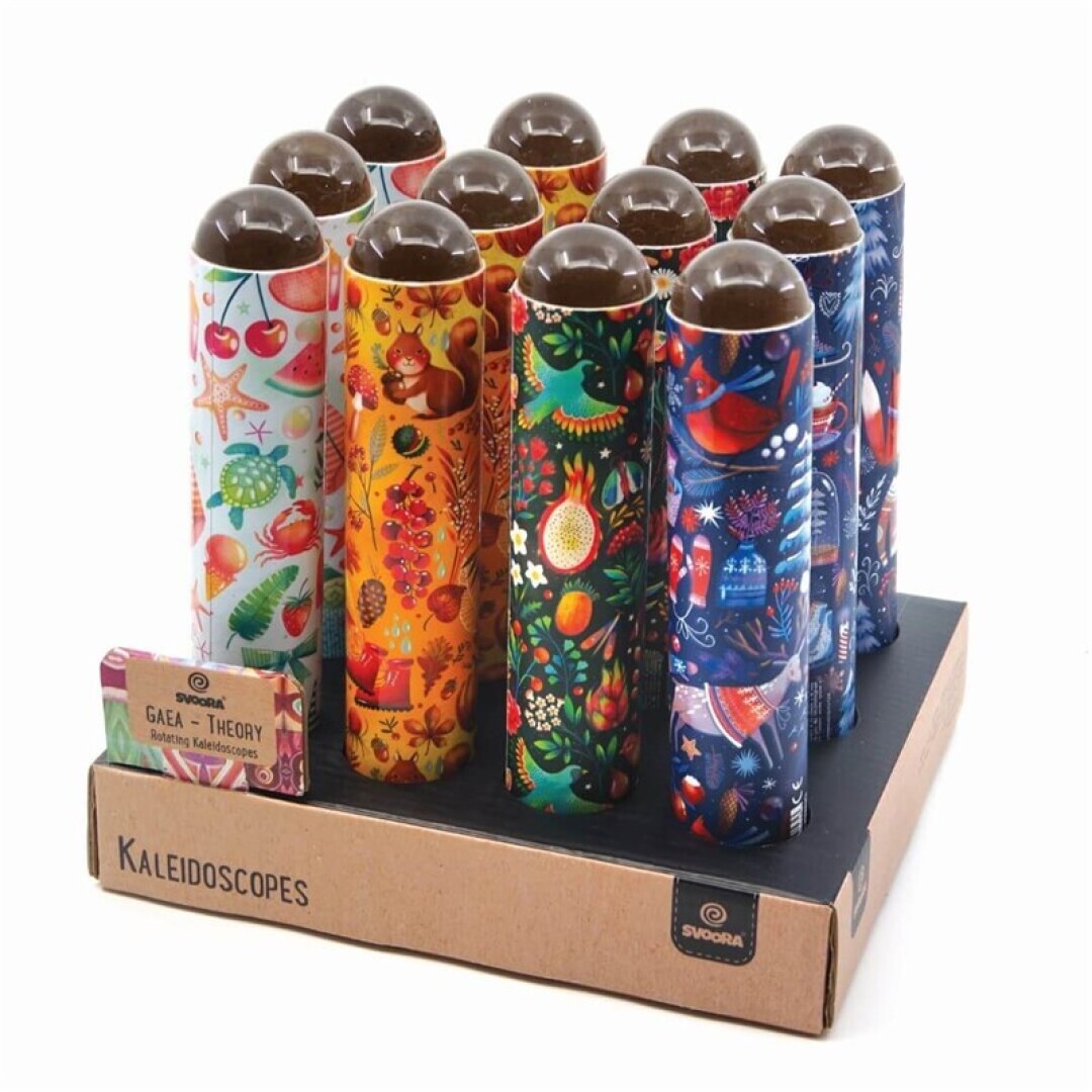 Este caleidoscopio es muy especial, y no sólo porque su diseño es mágic, sino porque utiliza una lente que descompone el mundo real que vemos con nuestros propios ojos. De este modo, la diversión no se acaba nunca porque cada vez que miramos a través del caleidoscopio podemos ver infinidad de cosas diferentes. Está formado a partir de un tubo de cartón duro y una lente semi-esférica de vidrio. Con este juguete tanto los niños y niñas cómo los y las más grandes experimentarán y estimularán su curiosidad, sobre todo con los juegos de luz y color y la capacidad de ver el mundo transformado en mil prismas.