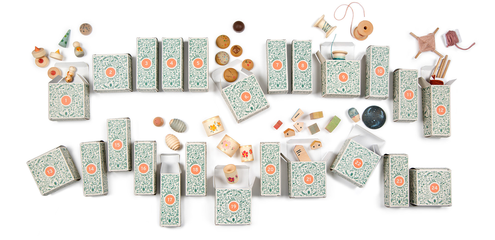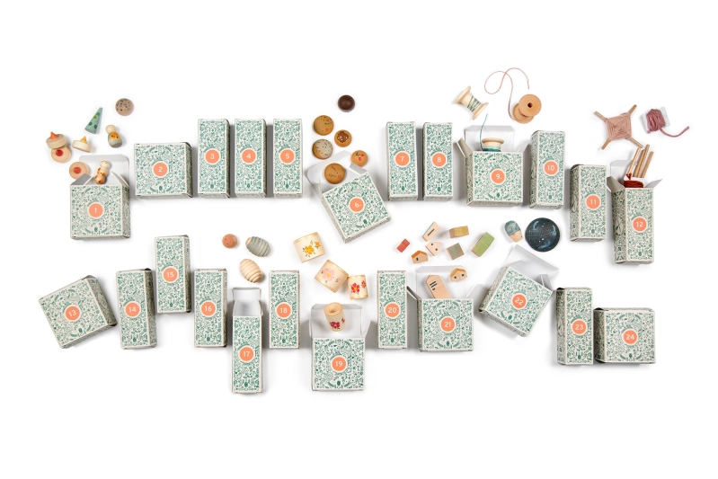 Incluye más de 150 piezas al siete: 24 cajas de cartón ilustradas y reutilizables / librito disponible en 10 idiomas (español + catalán, inglés, francés, alemán, holandés, italiano, japonés, coreano) #1: Cuatro velas y cuatro elementos para los reinos Waldorf / #2: Tió / #3: Piedras de madera / #4: Manualidad de flor de nieve / #5: Marioneta de dedo / #6: Galletas de Navidad / #7: Set de manualidades de hadas / #8: Baquetas pequeñas / #9: Set de bordado / #10: bombillas / #11: Juego de los sentidos / #12: Set de manualidades de amuleto / #13: Pequeñas setas / #14: Campana silenciosa / #15: Dado arco iris / #16: Bolsa de tesoros / #17: Familia lanuda / #18: Guirlanda de palomitas / #19: Tasas de cacao / #20: Cuello de perlas / #21: Ciudad mágica / #22: Búho nocturno / #23: Nin alegre / #24: Sorpresa!