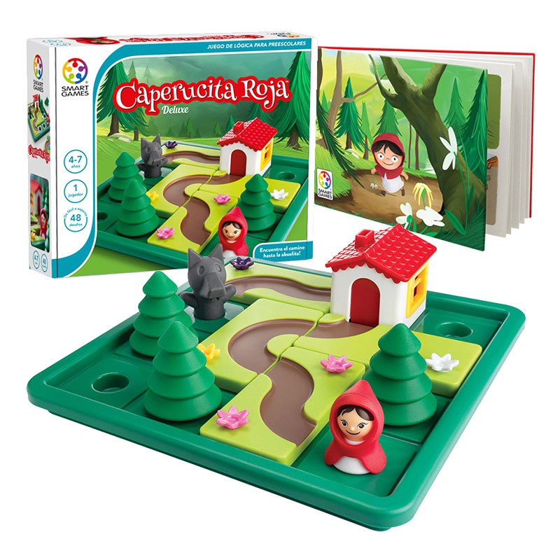 Caperucita Roja es un juego de ingenio pensado para los mas pequeños, ya que consiste en 5 piezas grandes y fáciles de manipular con caminos y flores