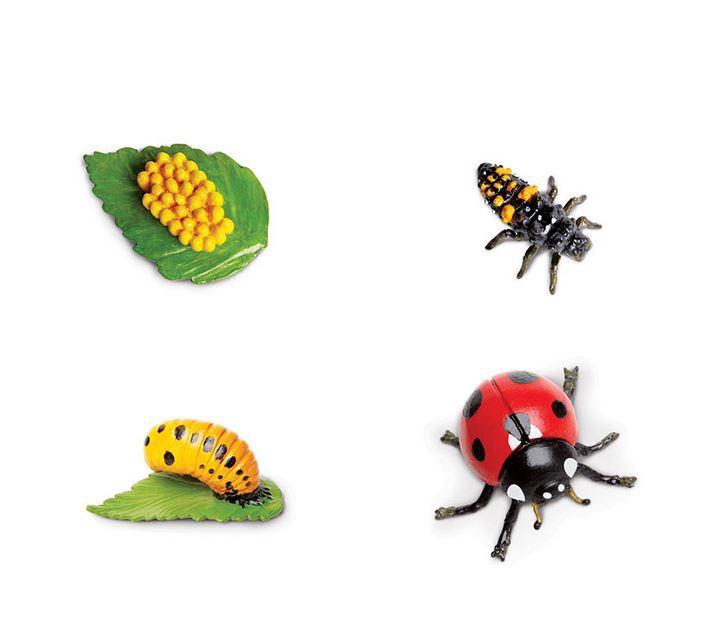 El insecto pasa a través de las cuatro etapas de la metamorfosis, la trama de un huevo para convertirse en una larva voraz, a continuación, formando una pupa de la que emerge el colorido de la mariquita.