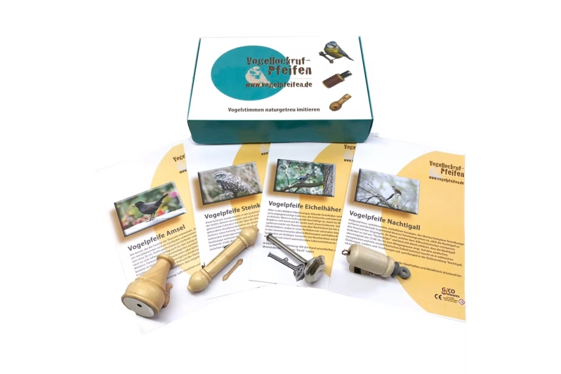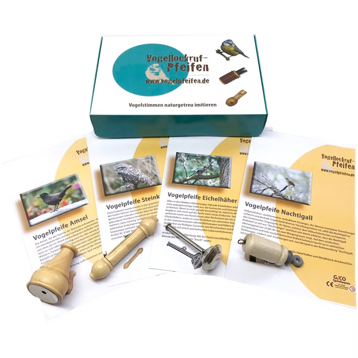 Juego de silbatos de pájaros con 4 conocidas llamadas: búho, mirlo, arrendajo y ruiseñor.