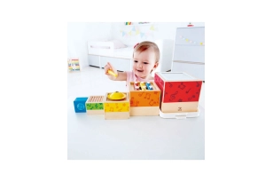 Ofrece materiales diversos en texturas, formas y colores, juguetes de madera natural, elementos para apilar y encajar, para arrastrar o empujar, objetos cotidianos adaptados que fomenten su curiosidad y creatividad, instrumentos de música sencillos...
