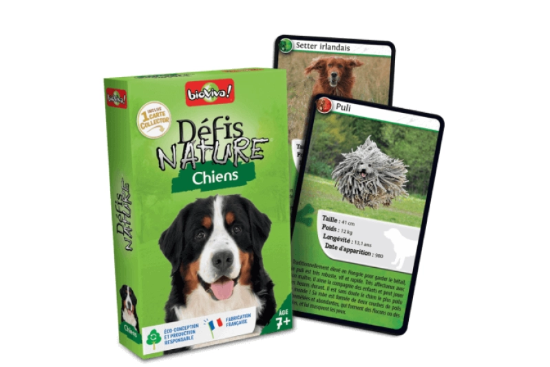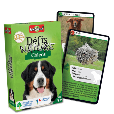 Desafíos de la Naturaleza: Perros es un emocionante juego de cartas diseñado para 2 a 6 jugadores y adecuado para niñas y niños a partir de 7 años. Fabricado en Francia, este juego permite a los participantes descubrir las razas de perros más divertidas y apostar por sus características más destacadas.