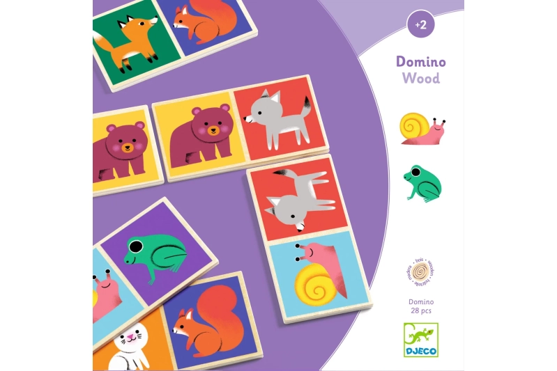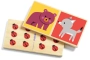 Domino de madera de 28 piezas con un lado de ilustraciones de animales y otro lado con asociación de numeración.