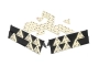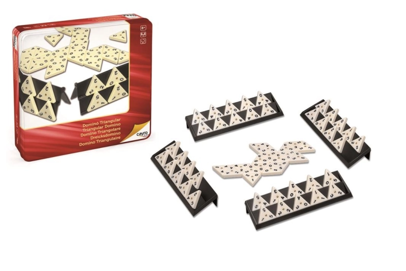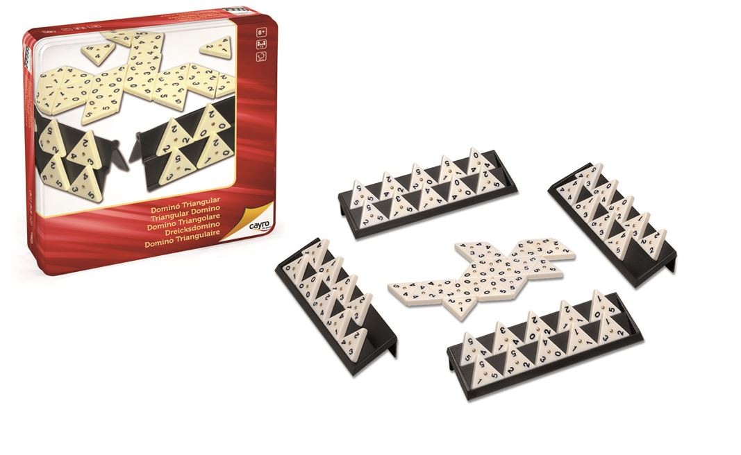 Con el domino triangular jugaremos con piezas en forma de triángulo, las cuales tendrán en cada vértice un número diferente. La dinámica del juego es la misma que la del domino clásico: debemos conseguir colocar las piezas de nuestro atril con las de la tabla haciendo coincidir los números de las piezas. El juego viene en una caja de lata y dispone de un atril para cada jugador o jugadora.