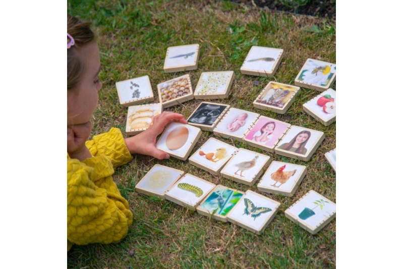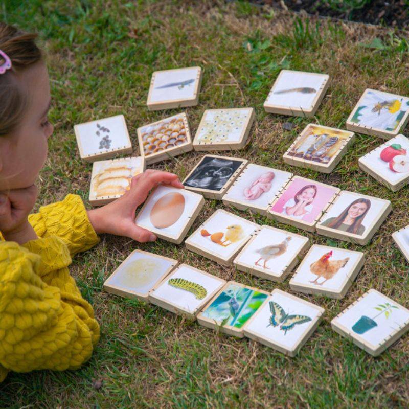4 etapas para cada ciclo vital en fichas autocorrectivas. Los niños pueden clasificarlas fácilmente en grupos de especies y aprender a diferenciar cada etapa.