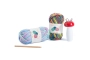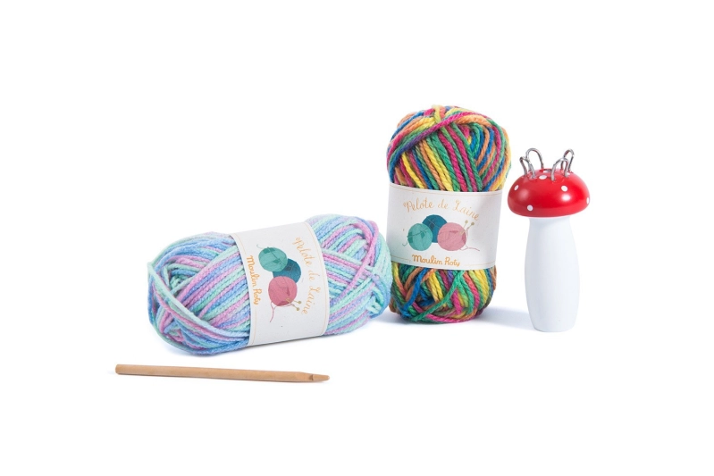 Con forma de seta, este tricotín permitirá a tu peque hacer hermosas creaciones coloridas. Este set contiene un tricotín, una aguja de ganchillo de madera y dos ovillos de lana multicolor, todo presentado en una caja de cartón ilustrada color azul cielo.