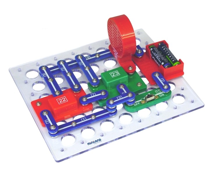 Los portapilas, motoras, altavoces, hélices, interruptores, portabombillas con bombillas, imanes, etc., se conectan de una manera fácil y segura.