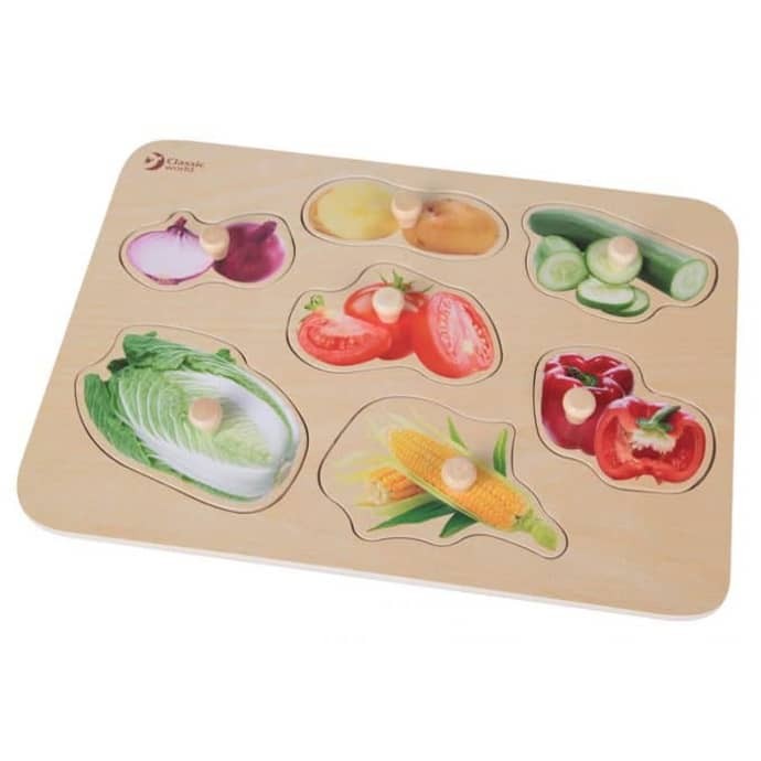 Rompecabezas hecho de madera, robusto y preciosamente ilustrado con imágenes reales de verduras. Sus pomos harán que las piezas sean fáciles de agarrar por las manos más pequeñas.