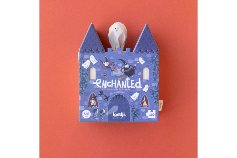 Adéntrate en el Enchanted Puzzle y descubre un mundo mágico! Completa el puzle, apaga las luces y observa como los fantasmas brillan a la oscuridad. Un juguete sostenible que te hará superar tus miedos mientras disfrutas jugando!