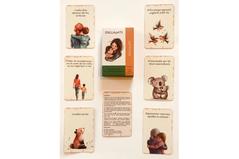 Enllaçats es un juego de cartas ilustradas pleno de frases bonitas y positivas.