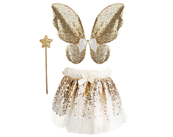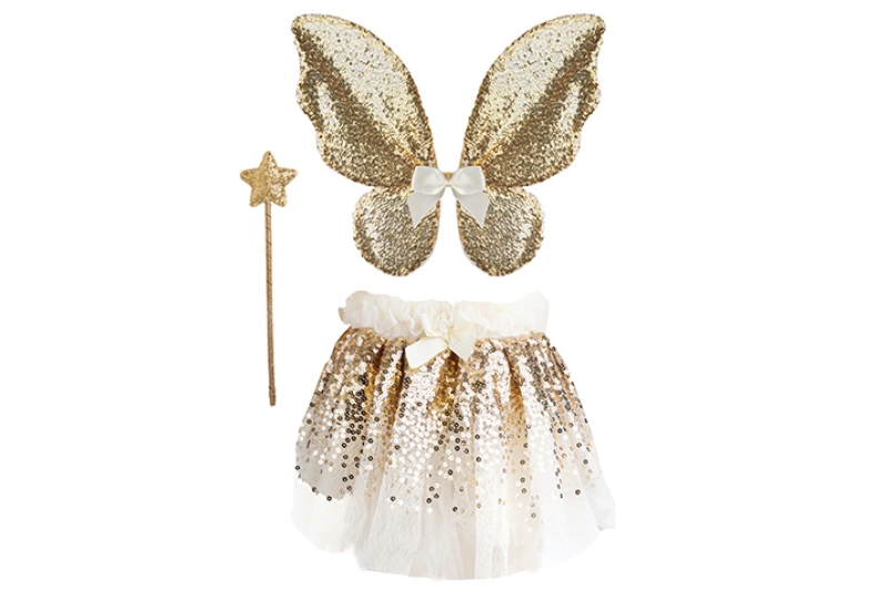 Falda Divertida de Lentejuelas Doradas con Alas Doradas y Varilla de Estrella, talla 4-6