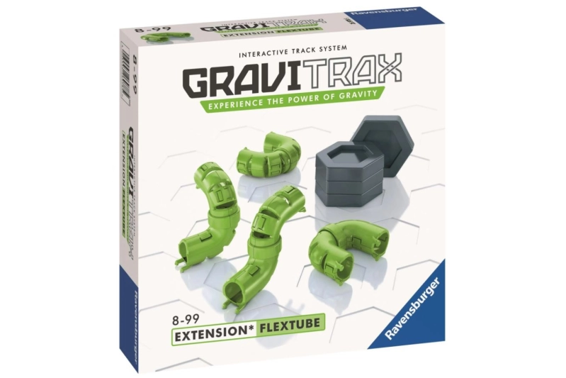 El FlexTube nos permitirá conectar fácilmente entre las diferentes alturas de las pistas. Con esta extensión podemos cambiar fácilmente la dirección de las bolas: el FlexTube se puede adaptar fácilmente a ángulos de 60 grados, formas en U y formas en S. Combinado con un Starter Set, también se puede controlar la velocidad de la pista. Esta extensión incluye piezas de altura adicionales para que pueda construir aún más arriba.