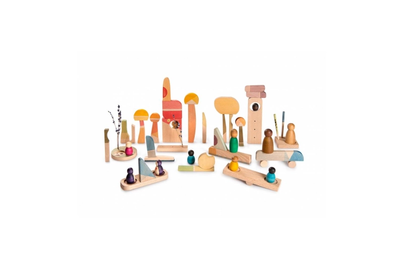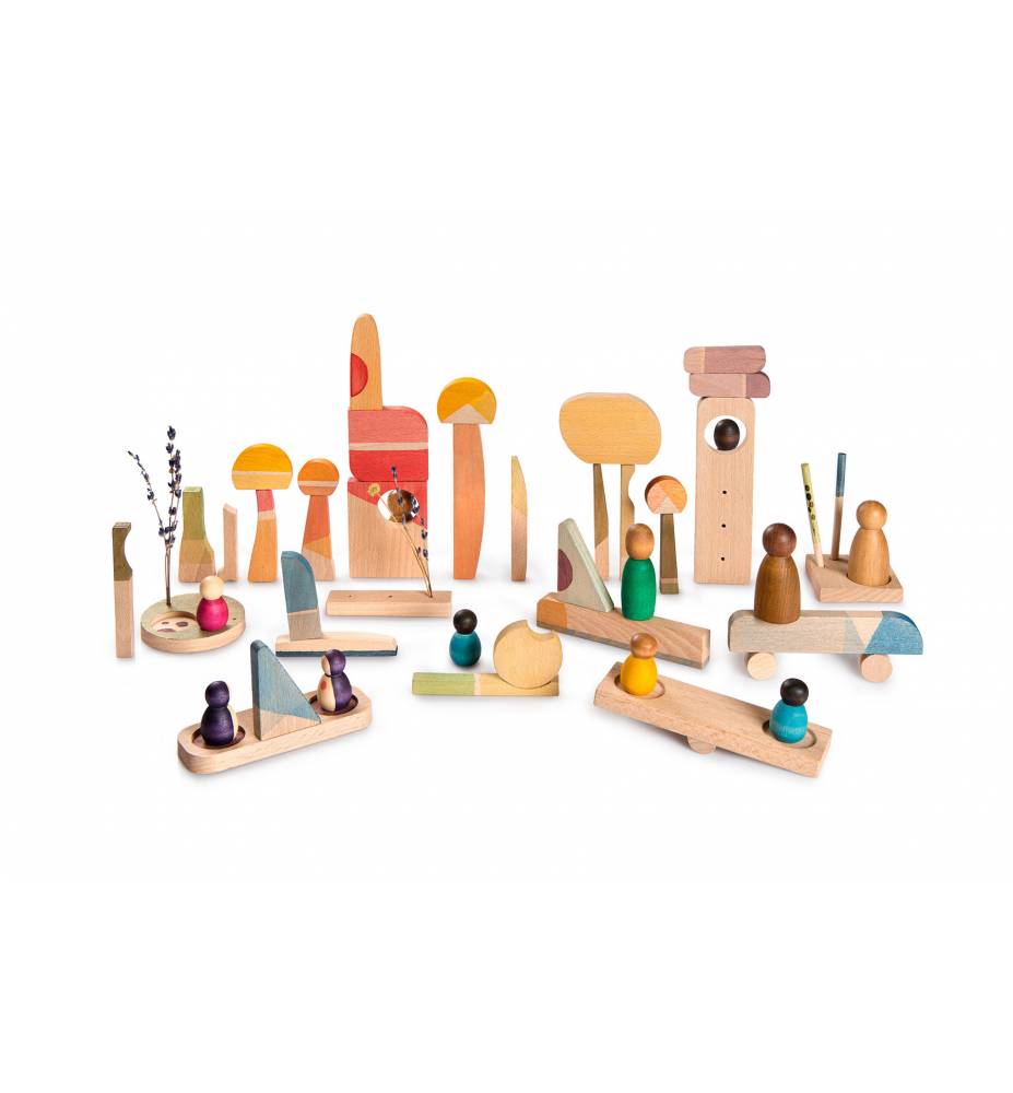 Un set compuesto por 40 piezas para construir tu lugar feliz. El set permite a los niños explorar por sí mismos a través de todas sus fases de aprendizaje. Es un gran complemento para la narración de historias y la creación de Mini Mundos, hasta apilar, encajar, combinar colores, un mundo infinito de posibilidades.