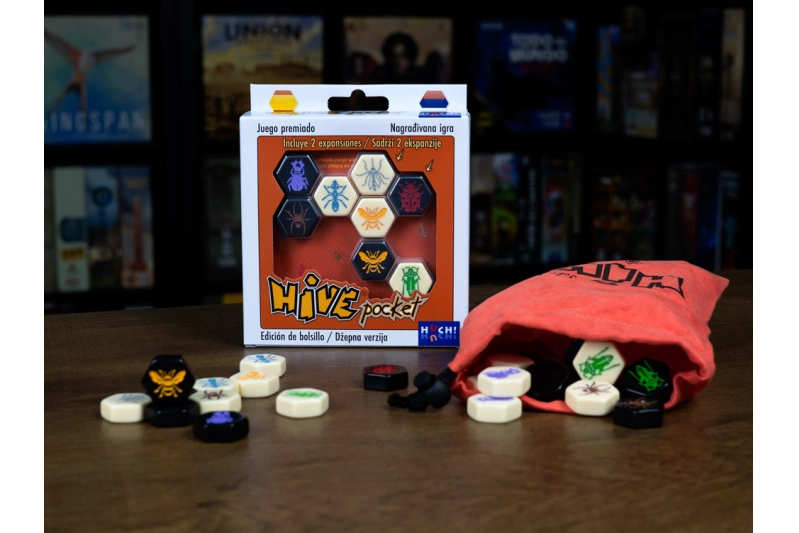 Hive pocket (Colmena para llevar) es el mismo maravilloso juego que todos amamos, pero en una versión compacta. Con todas sus piezas en una bolsa de tela portátil pequeño, este juego puede proporcionar la diversión en cualquier lugar!