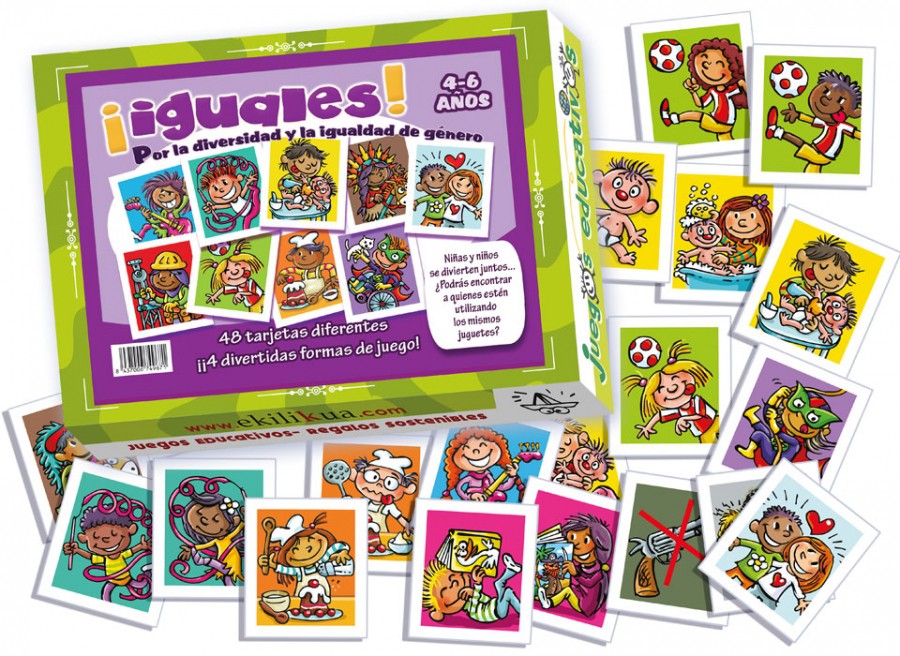 Incluye 4 formas de juego, de memoria y parejas, y a través de las ilustraciones de las tarjetas se transmiten valores positivos como el reparto de tareas, roles, igualdad, buenos tratos…