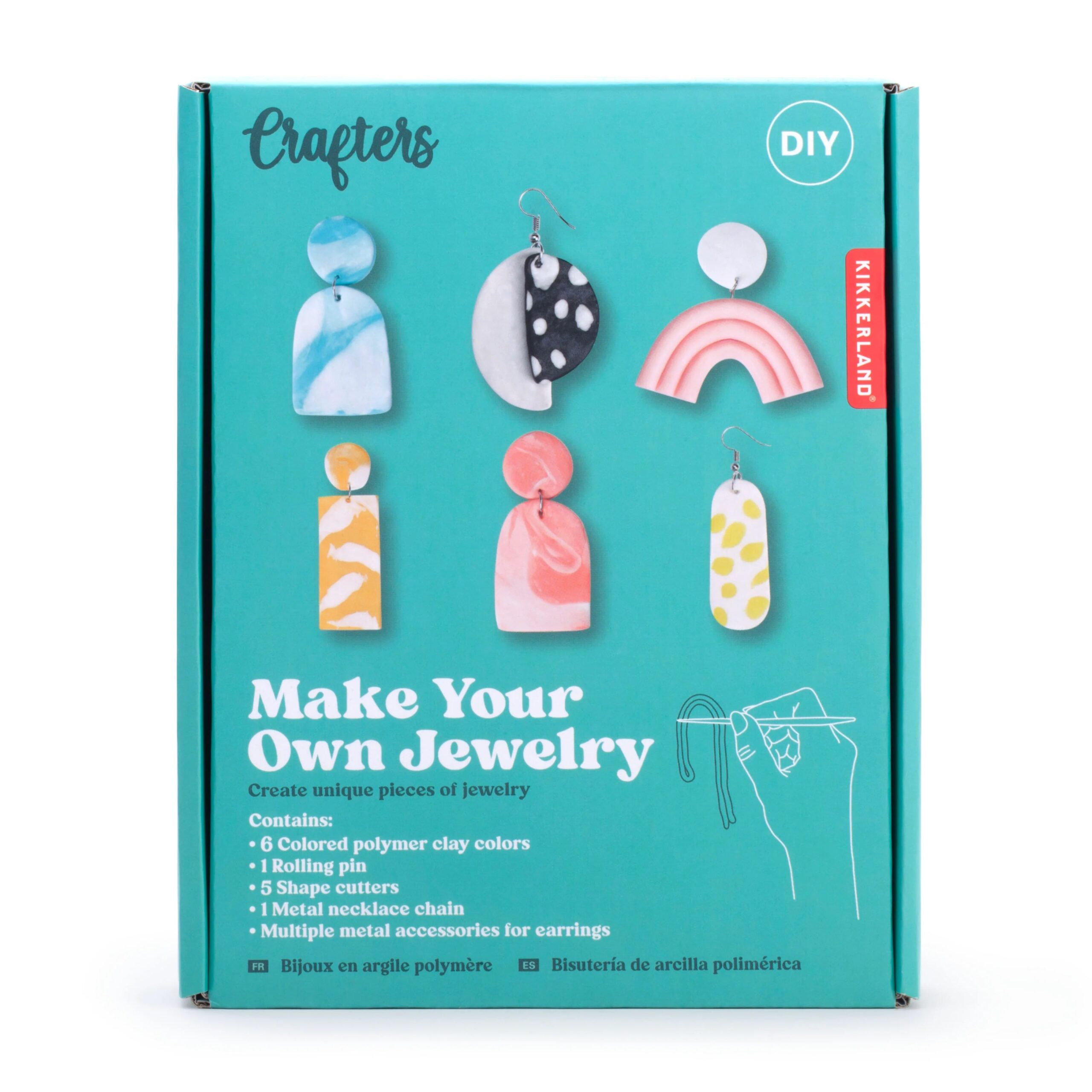 Kit creativo para hacer tus propias joyas de arcilla polimérica. Incluye seis colores, moldes para pendientes y un collar. Ideal para iniciarse y crear piezas únicas y personalizadas.