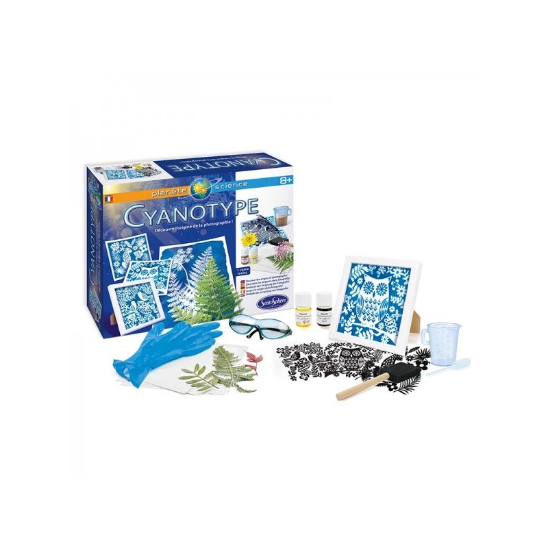 Descubre la técnica del cianotipo con nuestro Kit Cianotipia, ¡el arte ancestral de la fotografía monocromática! Este procedimiento fotográfico se realiza con una mezcla que reacciona a la luz, haciendo que las zonas expuestas aparezcan en un hermoso color azul de Prusia. Puedes utilizar las tapas adhesivas incluidas para tus creaciones o crear bonitos cuadros con flores y hojas secas. ¡Los 2 marcos incluidos te permitirán exponer tus creaciones más hermosas!Contenido del kit: