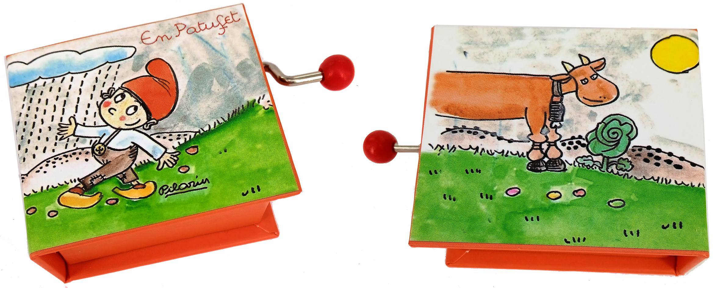 Este mecanismo musical de 18 láminas con manivela se presenta en una caja de cartón ilustrada en forma de libro.