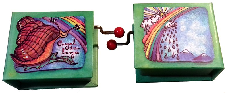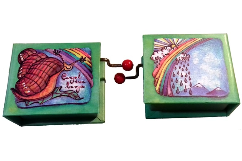 Este mecanismo musical de 18 láminas con manecilla se presenta en una caja de cartón ilustrada en forma de libreto.