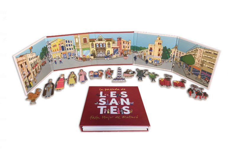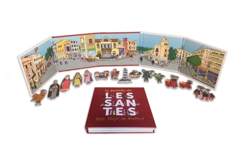 Libro-juego manipulativo de los elementos festivos de la ciudad de Mataró, donde los niños y niñas, jugando, podrán conocer el nombre de las figuras y familiarizarse con el recorrido del Pase de Las Santas del día 27 de julio.