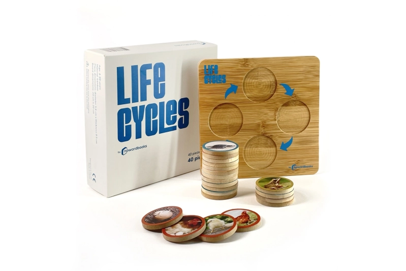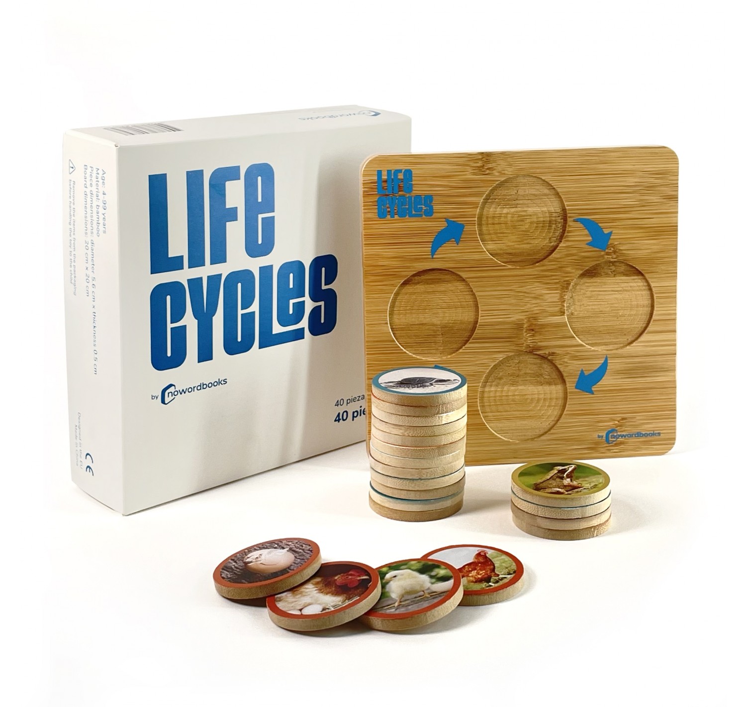 Conjunto de 40 piezas y tablero de bambú, que muestra el ciclo de la vida de 10 seres vivos, tanto animales como vegetales.