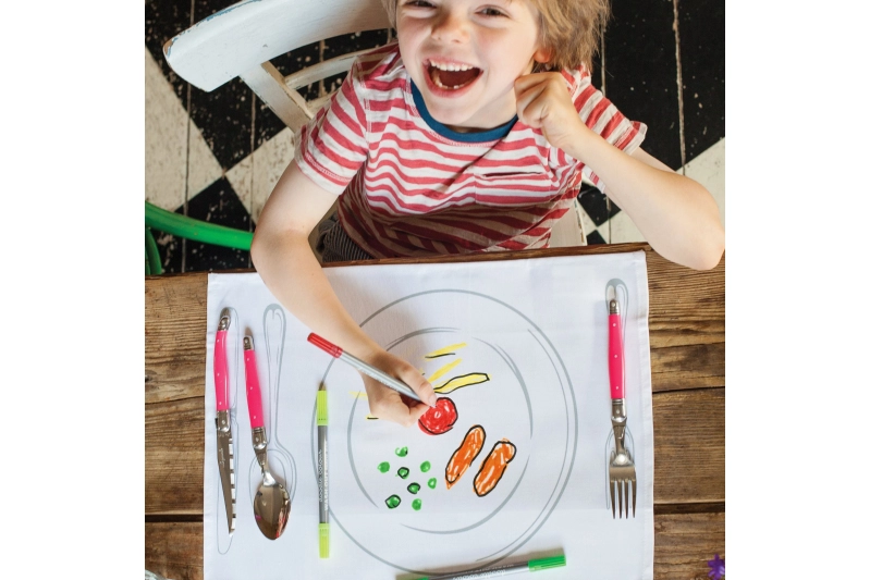 Vienen presentadas en su propio mini bolso de algodón y con un juego de diez bolígrafos téxtiles para que los niños dibujen y coloreen su mantel en la mesa. Cuando ya hayan finalizado el juego, simplemente lave el mantel en la máquina, la tinta desaparecerá por completo y estará lista para la próxima vez!