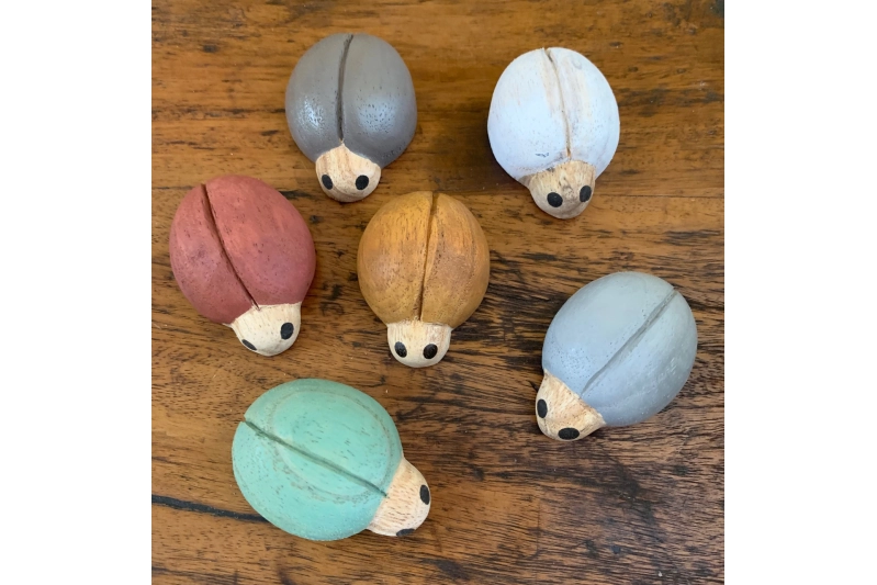 Estas mariquitas están elaboradas con madera y pintadas con tonos tierra, ofreciendo una experiencia sensorial rica y estimulante. Los colores cálidos como el naranja, el beige y los verdes aportan calidez y naturalidad al juguete, creando una conexión visual y táctil con los elementos naturales.