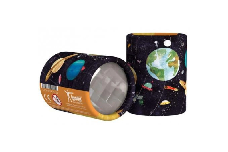 Fabricado a partir de cartón duro y decorado con un diseño muy original, este caleidoscopio de bolsillo consta de una lente dividida en multitud de fragmentos que permiten multiplicar la realidad del mundo que vemos a través.