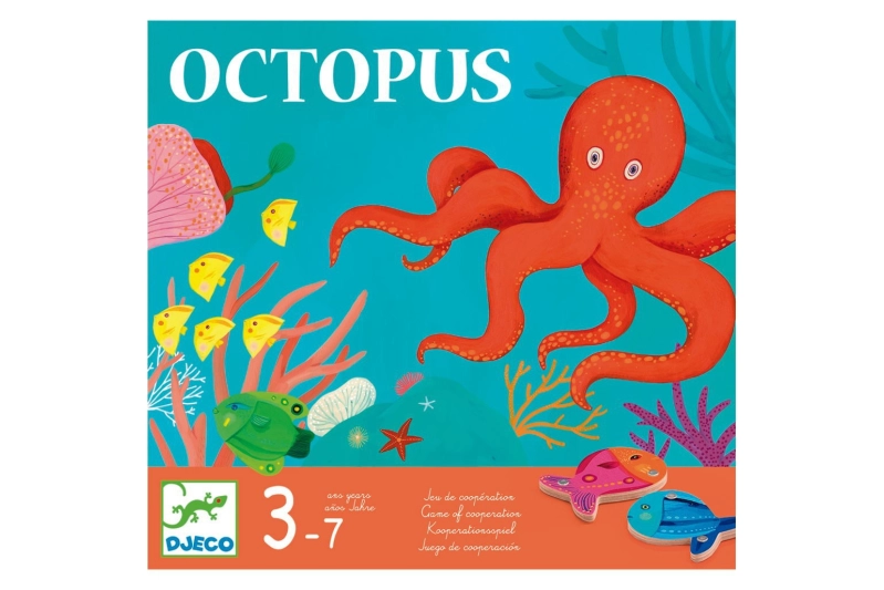 Contenido: 1 pulpo montable en dos piezas, 12 pececitos de madera con imanes, 2 cañas de pescar, 1 reloj de arena, instrucciones .