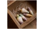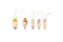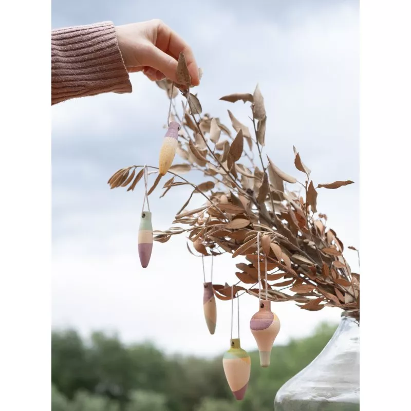 5 piezas de aproximadamente 6 cm que podremos colgar de cualquier lugar gracias a su cuerdas (árbol de Navidad, pomos, lámparas..) y que evocan a vasijas antiguas pintadas en tenues colores pastel.