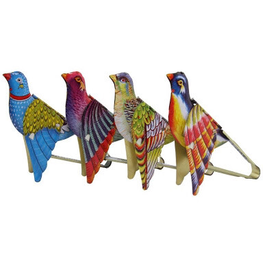 Este juguete mecánico de metal, chapa y hojalata brochada es dotado de un sistema de pinza de resorte para activar el silbido del pájaro.