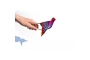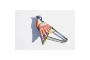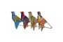Descripción del juguete mecánico de metal, chapa y hojalata brochado : pájaro silbador. Accionando la pinza, el pájaro bate las alas y empieza a silbar. El silbido se produce por un fuelle situado bajo el pájaro.