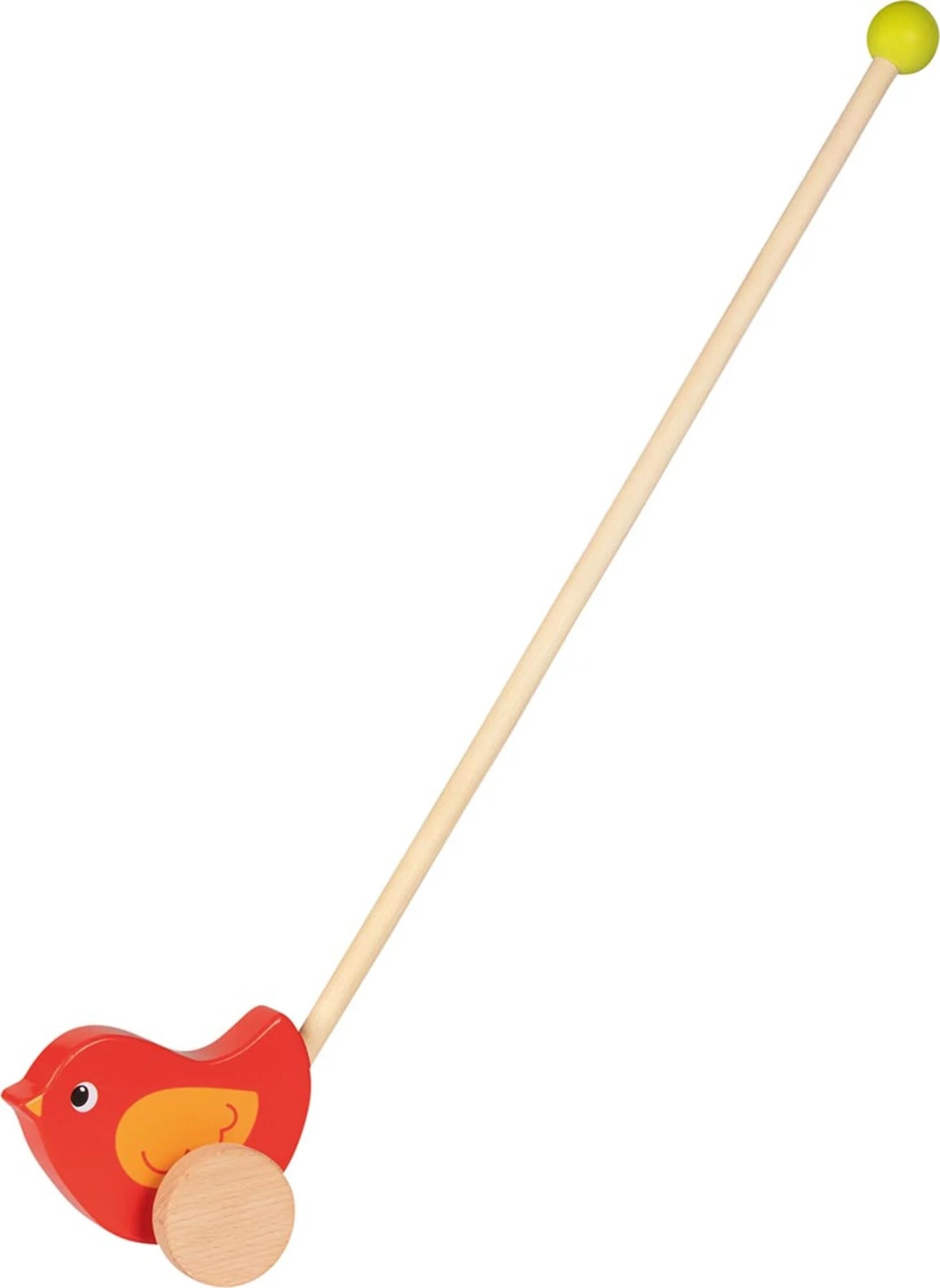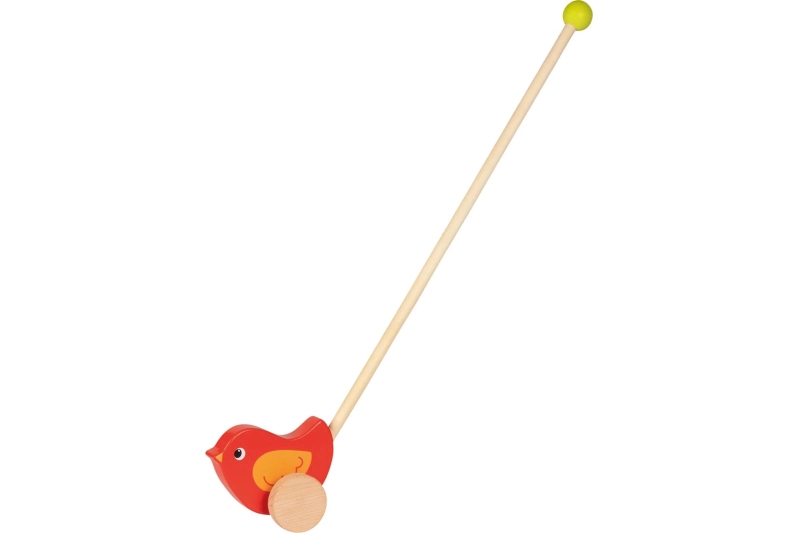 Con un tamaño adaptado a manos pequeñas y una varilla fácil de sujetar, este pájaro a empujar fomenta el juego activo y el descubrimiento del entorno. Recomendado a partir de 1 año, es una opción clásica y segura para familias que buscan juguetes de madera duraderos y educativos
