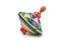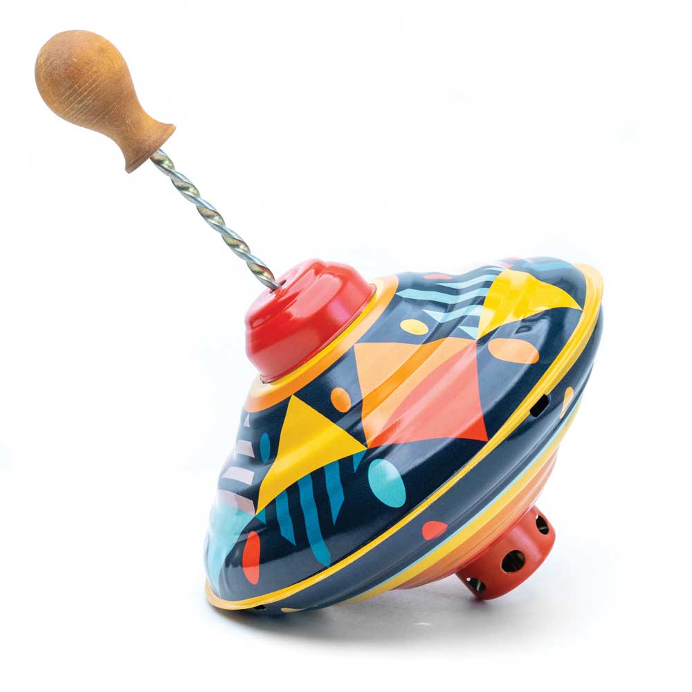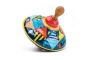 Magnífica peonza de chapa de alta calidad y de colores muy vivos. Simplemente subir y bajar el mango y la peonza empieza a girar y a zumbar agradablemente.