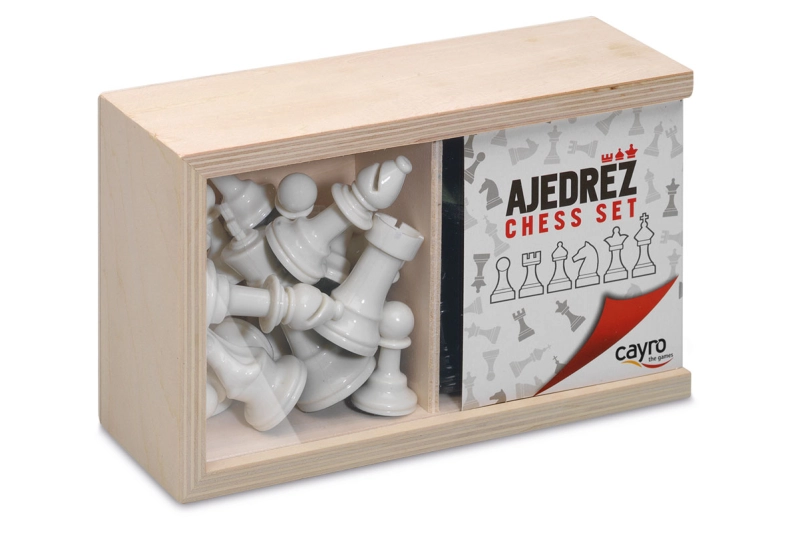 Incluye: Una caja de almacenaje, 2 caballos blancos, 2 caballos negros, 2 torres blancas, 2 torres negras, 2 alfiles blancos, 2 alfiles negros, 1 rey blanco, 1 rey negro, 1 reina blanca, 1 reina negra, 8 peones blancos y 8 peones negros.