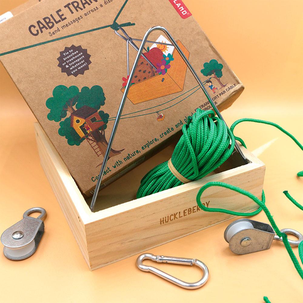 Este set para crear un sistema de transporte colgante funciona con un sistema similar al de un teleférico. La caja de madera esta preparada para ir y venir entre los diferentes puntos, los cables se pueden conectar entre dos árboles, mesas o postes ¿Estás preparado para realizar el envío?