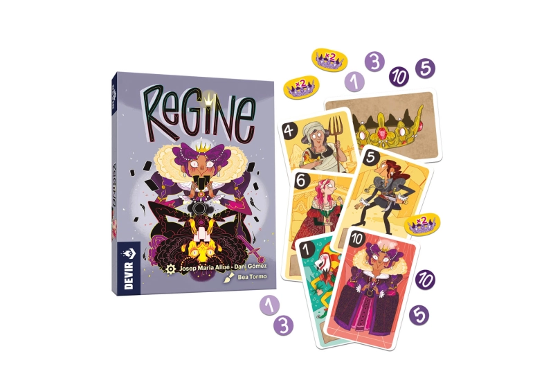 Regine es un juego de cartas con apuestas, engaños, fachendeo y puñaladas chatarreras. Consigue tu combinación de cartas ganadora y avanza a tus rivales en la escala social. Buena memoria y altas dosis de picardía serán sus mayores aliados. Partidas rápidas y horas de diversión. Lo disfrutarán desde pequeños a abuelos (pruebe a jugar con adultos amantes de las cartas). Eso sí, muévase con cautela entre caballeros y cortesanas, ¡no sea que se quede con las cartas equivocadas!