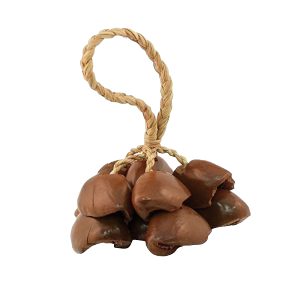 Sonajero de comercio justo y realizado artesanalmente con el caparazón de nueces de palma secos fijados en una cuerda de rafia tejida en Ghana (África). Al agitar proporciona un sonido agradable.
