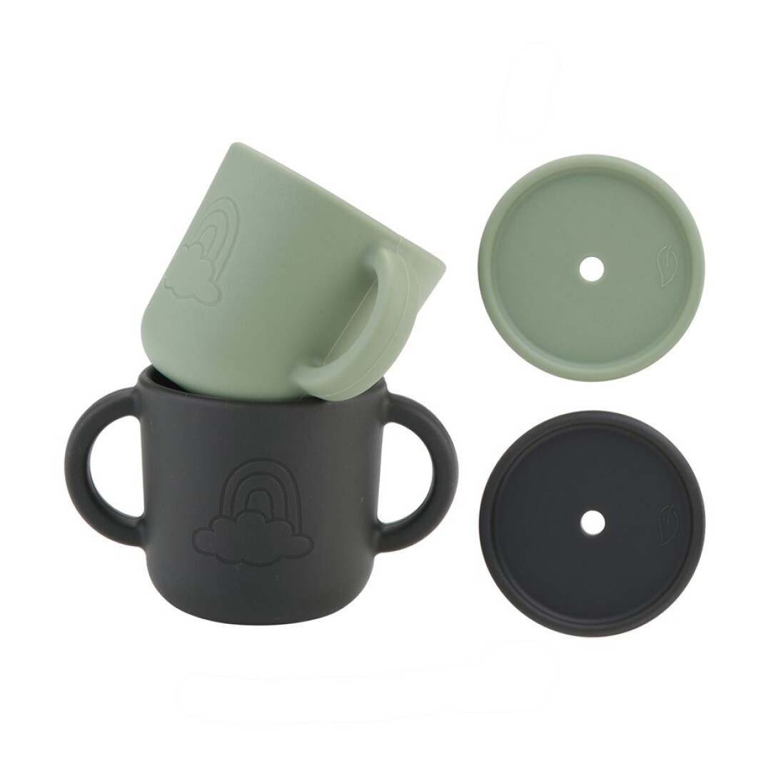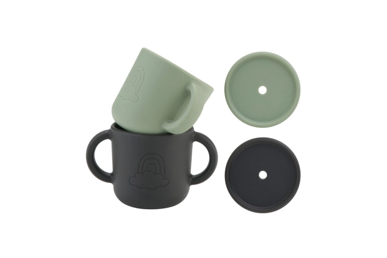 Las tazas de silicona con asas son buenas para fortalecer las habilidades motoras de los dedos del niño.