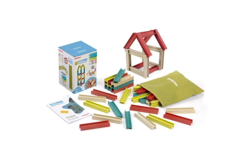 Conjunto de construcción compuesto por 32 vigas de colores hechas de materiales ecológicos que reducen el impacto ambiental.
